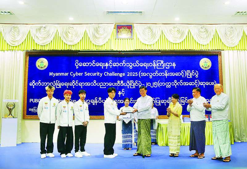 Myanmar Cyber Security Challenge 2025 (အလွတ်တန်း အဆင့်) ပြိုင်ပွဲ၊ ဆိုက်ဘာလုံခြုံ ရေးအသိပညာပေးဗီဒီယိုပြိုင်ပွဲ ၂၀၂၅(တက္ကသိုလ်အဆင့်) ဆုပေးပွဲနှင့် ဆော်ဒီအာရေဗျနိုင်ငံ ရီယက်ဒ်မြို့၌ ကျင်းပပြုလုပ်ခဲ့သည့် PlayerUnknown’s Battlegrounds (PUBG) Mobile World Cup တွင် ကမ္ဘာ့ချန်ပီယံဆုရရှိခဲ့သည့် Yangon Galacticos အသင်းအား ဂုဏ်ပြုဆုချီးမြှင့်ပွဲအခမ်းအနားကို ယနေ့နံနက်ပိုင်းတွင် နေပြည်တော်ရှိ ပို့ဆောင်ရေးနှင့်ဆက်သွယ်ရေးဝန်ကြီးဌာန ရုံးအမှတ်(၂) ၌ကျင်းပရာ ပြည်ထောင်စုဝန်ကြီး ဦးမြထွန်းဦး တက်ရောက်အမှာစကားပြောကြားသည်။