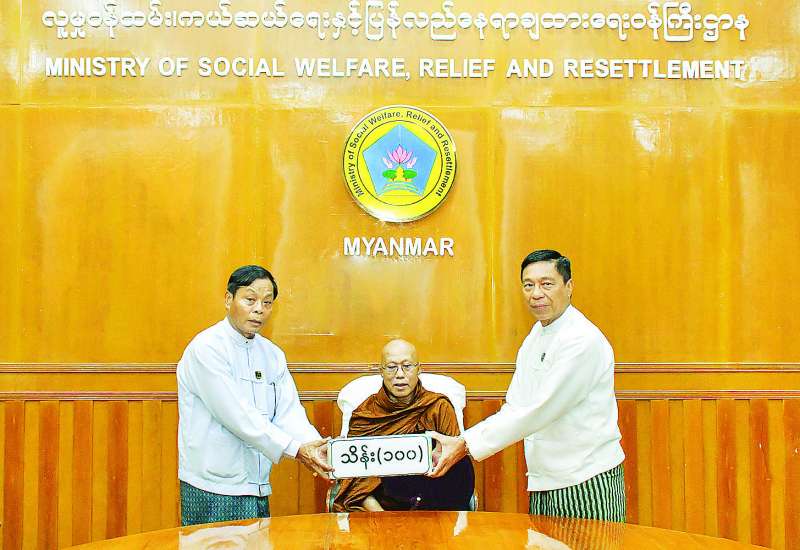 မန္တလေးငလျင် ဘေးသင့်ပြည်သူများအတွက် လိုအပ်သည့်ထောက်ပံ့မှုများနှင့် ပြန်လည်ထူထောင်ရေးလုပ်ငန်းများ ဆောင်ရွက်နိုင်ရန်အတွက် ယနေ့မွန်းလွဲ ၁ နာရီတွင် မန္တလေးတိုင်းဒေသကြီး မတ္တရာမြို့ ချမ်းသာကြီးကျောင်းတိုက် ဆရာတော်ဘဒ္ဒန္တနန္ဒဝံသနှင့် တပည့်ရဟန်း၊ သာမဏေ၊ ဒါယကာ၊ ဒါယိကာမတို့က ငွေကျပ်သိန်း ၁၀၀ ကို လူမှုဝန်ထမ်း၊ ကယ်ဆယ်ရေးနှင့် ပြန်လည်နေရာချထားရေးဝန်ကြီးဌာန အစည်းအဝေးခန်းမ၌ လာရောက်ပေးအပ်လှူဒါန်းသည်။