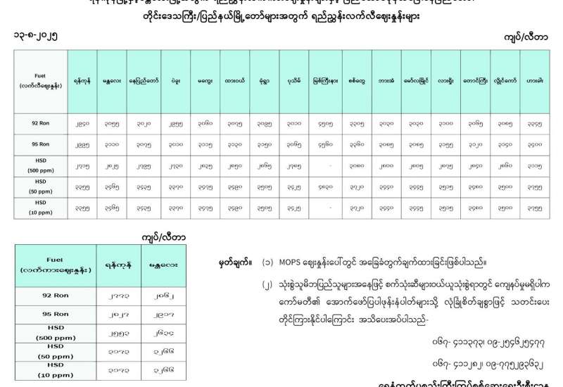 ရန်ကုန်မြို့နှင့် မန္တလေးမြို့အတွက် ရည်ညွှန်းလက်ကားဈေးနှုန်းများနှင့် ပြည်ထောင်စုနယ်မြေ နေပြည်တော်၊ တိုင်းဒေသကြီး/ပြည်နယ် မြို့တော်များအတွက် ရည်ညွှန်းလက်လီဈေးနှုန်းများ