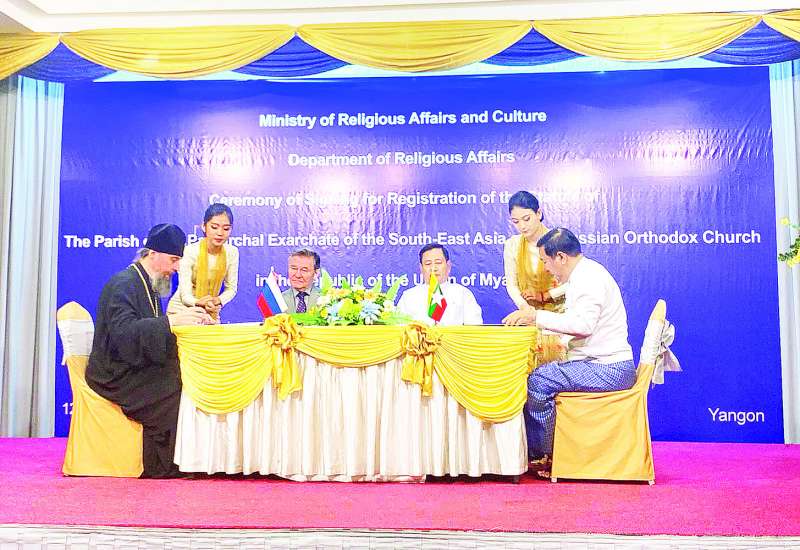 သာသနာရေးနှင့်ယဉ်ကျေးမှုဝန်ကြီးဌာနက အရှေ့တောင်အာရှဆိုင်ရာ ရုရှားအော်သိုဒေါ့ခရစ်ယာန်အသင်းတော်၏ မြန်မာနိုင်ငံဆိုင်ရာ အသင်းတော်စည်းမျဉ်းများကို လက်မှတ်ရေးထိုးမှတ်တမ်းတင်ခြင်းအခမ်းအနားကို ယနေ့နံနက် ၁၁ နာရီတွင် ရန်ကုန်မြို့ရှိ Summit Parkview Hotel ၌ ကျင်းပသည်။