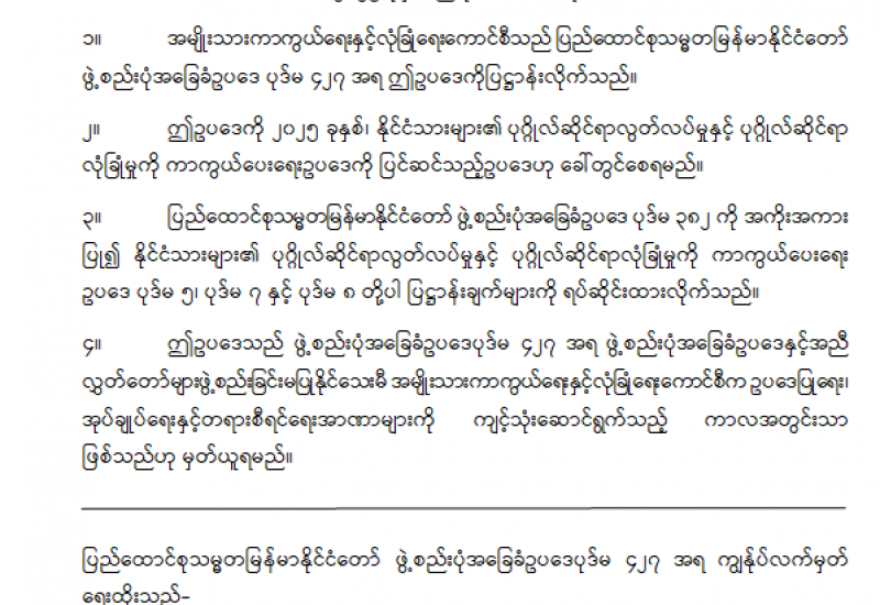 ဖွဲ့စည်းပုံအခြေခံဥပဒေ(၂၀၀၈ ခုနှစ်) ပုဒ်မ ၄၂၉ တွင် အမျိုးသားကာကွယ်ရေးနှင့် လုံခြုံရေးကောင်စီသည် ပုဒ်မ ၄၂၆ အရ အမိန့်ကို ပယ်ဖျက်ကြောင်း ကြေညာသည့်နေ့မှစ၍ ခြောက်လအတွင်း ဖွဲ့စည်းပုံအခြေခံဥပဒေပါ ပြဋ္ဌာန်းချက်များနှင့်အညီ ပါတီစုံဒီမိုကရေစီအထွေထွေရွေးကောက်ပွဲကို ကျင်းပပေးရမည်ဖြစ်သည်။ ပုဒ်မ ၄၂၈ အရ ဖွဲ့စည်းထားသည့် အဖွဲ့အစည်းများသည် အထွေထွေရွေးကောက်ပွဲကျင်းပပြီး ဖွဲ့စည်းပုံအခြေခံဥပဒေနှင့်အညီ ဖွဲ့စည်းထားသည့် ဥပဒေပြုရေး၊ အုပ်ချုပ်ရေးနှင့် တရားစီရင်ရေး အဖွဲ့အစည်းများ ဖွဲ့စည်းပြီးသည်အထိ မိမိတို့၏ လုပ်ငန်း တာဝန်များကို ဆက်လက်ဆောင်ရွက်ရမည်ဖြစ်ကြောင်း ပုဒ်မ ၄၃၀ တွင် ပြဋ္ဌာန်း ထားသည်။