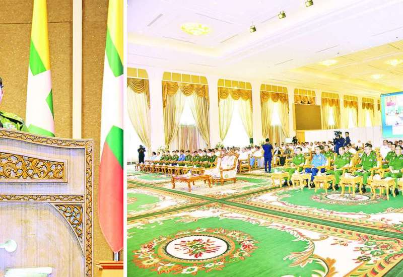 ပြည်ထောင်စုသမ္မတမြန်မာနိုင်ငံတော် နိုင်ငံတော်စီမံအုပ်ချုပ်ရေးကောင်စီ ဂုဏ်ပြုတွေ့ဆုံပွဲအခမ်းအနားကို ယနေ့နံနက်ပိုင်းတွင် နေပြည်တော်ရှိ ဇေယျာသီရိဗိမာန် ရေခဲတောင်ခန်းမ၌ ကျင်းပပြုလုပ်ရာ နိုင်ငံတော်စီမံအုပ်ချုပ်ရေးကောင်စီဥက္ကဋ္ဌ နိုင်ငံတော်ဝန်ကြီးချုပ် ဗိုလ်ချုပ်မှူးကြီးမင်းအောင်လှိုင် တက်ရောက်အမှာစကားပြောကြားသည်။