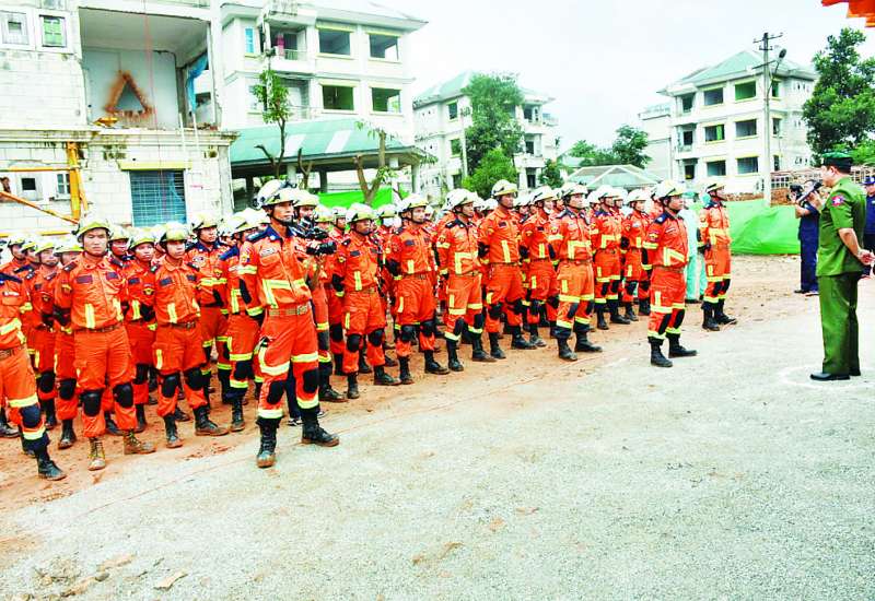 မြို့ပြရှာဖွေကယ်ဆယ်ရေးအဖွဲ့ (Medium Urban Search and Rescue Team) ဖွဲ့စည်းရန်ရည်ရွယ်၍ မေ ၁၂ ရက်မှ ဩဂုတ် ၁ ရက်အထိရက်သတ္တ ၁၂ ပတ်ကြာ စုဖွဲ့လေ့ကျင့်လျက်ရှိသော ပြည်ထဲရေးဝန်ကြီးဌာန၊ မီးသတ်ဦးစီးဌာနမှ အထူးရှာဖွေကယ်ဆယ်ရေးတပ်ဖွဲ့ဝင် ၁၀၀ တို့သည် ယမန်နေ့က ဇမ္ဗူသီရိမြို့နယ် ဗလသိဒ္ဓိရပ်ကွက်၌ ငလျင်ဘေးအန္တရာယ်ဆိုင်ရာ လက်တွေ့ကယ်ဆယ်ရေးလေ့ကျင့်ခန်းများ ပြုလုပ်ဆောင်ရွက်ခဲ့ရာ ပြည်ထောင်စုဝန်ကြီး ဒုတိယဗိုလ်ချုပ်ကြီး ထွန်းထွန်းနောင် တက်ရောက်ကြည့်ရှုအားပေးပြီး လိုအပ်သည်များမှာကြားကာ ဂုဏ်ပြုဆုငွေများချီးမြှင့်ပေးအပ်ခဲ့သည်။