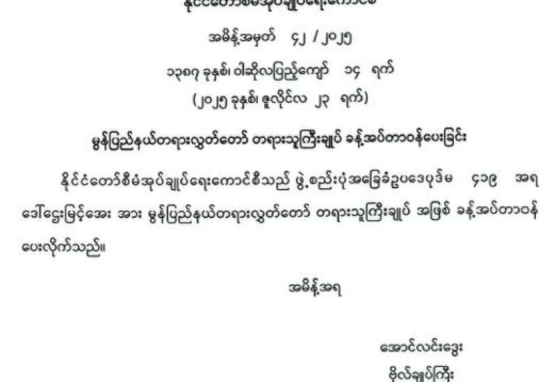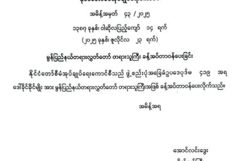 မွန်ပြည်နယ်တရားလွှတ်တော် တရားသူကြီး ခန့်အပ်တာဝန်ပေးခြင်း