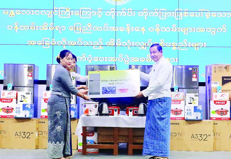 ငလျင်ဒဏ်ကြောင့် ပြည်ထောင်စုနယ်မြေ နေပြည်တော်တွင် တိုက်ပိ၊ တိုက်ပြားဖြစ်ပေါ်ခဲ့သော ဝန်ကြီးဌာန၊ အဖွဲ့အစည်း ၂၅ ခုမှ ဝန်ထမ်းအိမ်ရာ မြေညီထပ်အခန်း ၄၉၉ ခန်းအတွက် အခြေခံလိုအပ်သည့် မီးဖိုချောင်သုံးနှင့် အိမ်သုံးလျှပ်စစ်ပစ္စည်း ခြောက်မျိုးထောက်ပံ့ပေးအပ်ပွဲကို ယနေ့နံနက်ပိုင်းတွင် အမျိုးသားသဘာဝဘေးအန္တရာယ်ဆိုင်ရာ စီမံခန့်ခွဲမှုကော်မတီဒုတိယဥက္ကဋ္ဌ ပြည်ထောင်စုဝန်ကြီးများဦးဆောင်၍ လူမှုဝန်ထမ်း၊ ကယ်ဆယ်ရေးနှင့် ပြန်လည်နေရာချထားရေးဝန်ကြီးဌာန စုပေါင်းခန်းမ၌ ကျင်းပသည်။