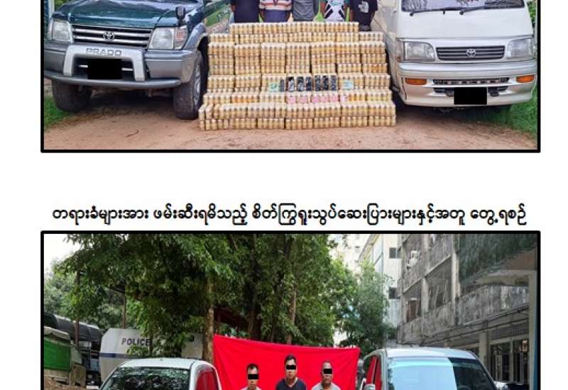 မူးယစ်ဆေးဝါးတားဆီးနှိမ်နင်းရေးရဲတပ်ဖွဲ့မှ တပ်ဖွဲ့ဝင်များပါဝင်သော ပူးပေါင်းအဖွဲ့သည် ဇွန်လ ၄ ရက်နေ့ မွန်းလွဲ ၁၂၃၀ အချိန် ပြည်-အောင်လံသွား ကားလမ်းရှိ တိုးဂိတ်အနီး၌ မူးယစ်ဆေးဝါးများ အရောင်းအဝယ်ပြုလုပ်မည်ဖြစ်ကြောင်း သတင်းအရစောင့်ဆိုင်းနေစဉ် အောင်ဇော်ဦး မောင်းနှင်သည့် TOYOTA PRADO မော်တော်ယာဉ်ပေါ်မှ ဘိုဘိုအောင် မောင်းနှင်ပြီး ဇင်သူအောင်၊ အောင်ပြည့်ဖြိုးတို့ လိုက်ပါလာသည့် I-ZONE မော်တော်ယာဉ်ပေါ်သို့ လွှဲပြောင်းတင်ဆောင်နေစဉ် ရှာဖွေစစ်ဆေးခဲ့ရာ ၎င်းတို့ ၄ ဦးနှင့်အတူ စိတ်ကြွရူးသွပ်ဆေးပြား ၅ သိန်းပြားအား ဖမ်းဆီးရမိခဲ့ကြောင်း၊
