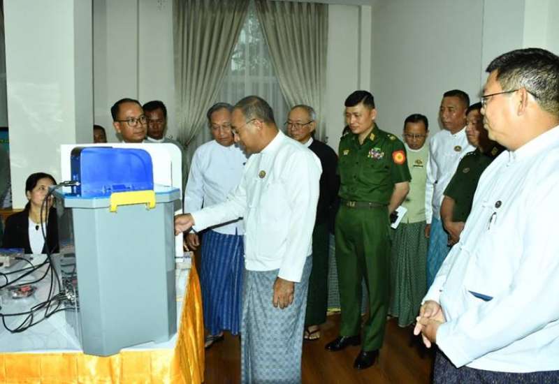 မြန်မာအီလက်ထရောနစ် မဲပေးစက် (MEVM) နှင့် စပ်လျဉ်း၍ ရှင်းလင်းပြသခြင်းနှင့် လက်တွေ့စမ်းသပ်မဲပေးခြင်းကို ယနေ့နံနက်ပိုင်းတွင် ရှမ်းပြည်နယ် (တောင်ပိုင်း)၊ တောင်ကြီးမြို့ရှိ ပြည်နယ်အစိုးရအဖွဲ့ရုံးအစည်းအဝေးခန်းမ၌ ပြုလုပ်ရာ ရှမ်းပြည်နယ် ဝန်ကြီးချုပ် ဦးအောင်အောင်၊ အရှေ့ပိုင်းတိုင်းစစ်ဌာနချုပ် တိုင်းမှူး ဗိုလ်ချုပ် ဇော်မင်းလတ်နှင့် တာဝန်ရှိသူများ၊ ပြည်ထောင်စုရွေးကောက်ပွဲကော်မရှင်အဖွဲ့မှ တာဝန်ရှိသူများ၊ ဌာနဆိုင်ရာဝန်ထမ်းများနှင့် ဖိတ်ကြားထားသူများ တက်ရောက်ကြသည်။