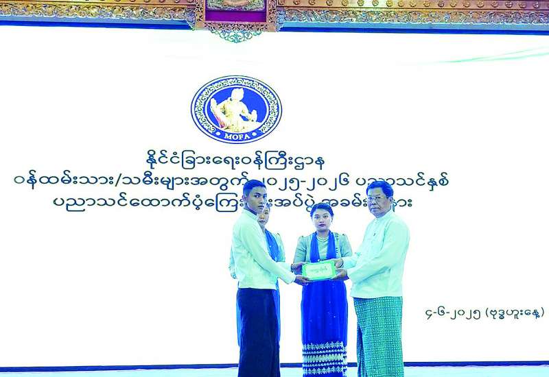 နိုင်ငံခြားရေးဝန်ကြီးဌာနဝန်ထမ်းသားသမီးများအား ၂၀၂၅-၂၀၂၆ ပညာသင်နှစ်အတွက်ပညာသင် ထောက်ပံ့ကြေးပေးအပ်ခြင်းအခမ်းအနားကို ယနေ့နံနက် ၁၀ နာရီခွဲတွင် နိုင်ငံခြားရေးဝန်ကြီးဌာန ရုံးအမှတ် (၉) လောကနတ်ခန်းမ၌ကျင်းပ ရာဒုတိယဝန်ကြီးချုပ်နှင့် နိုင်ငံခြားရေးဝန်ကြီးဌာန ပြည်ထောင်စုဝန်ကြီး ဦးသန်းဆွေ တက်ရောက်အမှာစကားပြောကြားသည်။
