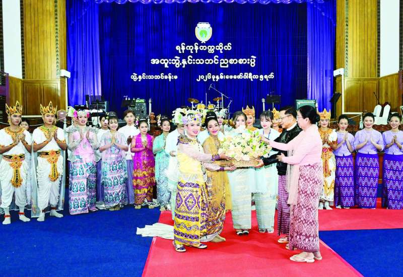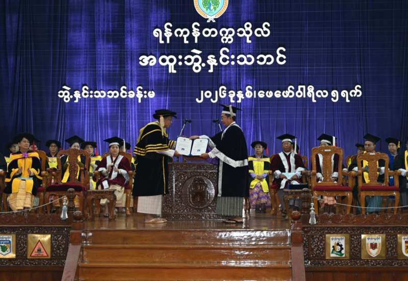 ပြည်ထောင်စုသမ္မတမြန်မာနိုင်ငံတော်ယာယီသမ္မတ နိုင်ငံတော်လုံခြုံရေးနှင့် အေးချမ်းသာယာရေးကော်မရှင်ဥက္ကဋ္ဌ ဗိုလ်ချုပ်မှူးကြီး မင်းအောင်လှိုင်အား ရန်ကုန်တက္ကသိုလ်မှ ဂုဏ်ထူးဆောင် ပြည်သူ့ရေးရာ စီမံခန့်ခွဲမှုပါရဂူဘွဲ့ Honorary Doctor of Public Administration(D.P.A. honoris causa) ဘွဲ့အပ်နှင်းခြင်း၊ ရန်ကုန်တက္ကသိုလ် အထူးဘွဲ့နှင်းသဘင်အထိမ်းအမှတ် ဂုဏ်ပြုညစာစားပွဲ အခမ်းအနားအား ယနေ့ညနေပိုင်းတွင် ရန်ကုန်တက္ကသိုလ် ဘွဲ့နှင်းသဘင်ခန်းမ၌ ကျင်းပ ပြုလုပ်သည်။