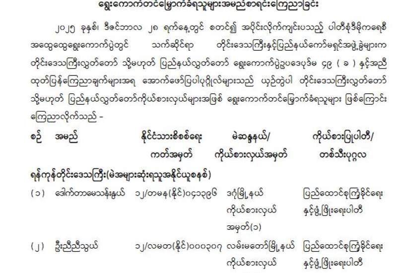 တိုင်းဒေသကြီးလွှတ်တော် သို့မဟုတ် ပြည်နယ်လွှတ်တော်ကိုယ်စားလှယ်အဖြစ် ရွေးကောက်တင်မြှောက်ခံရသူများ အမည်စာရင်းကြေညာခြင်း