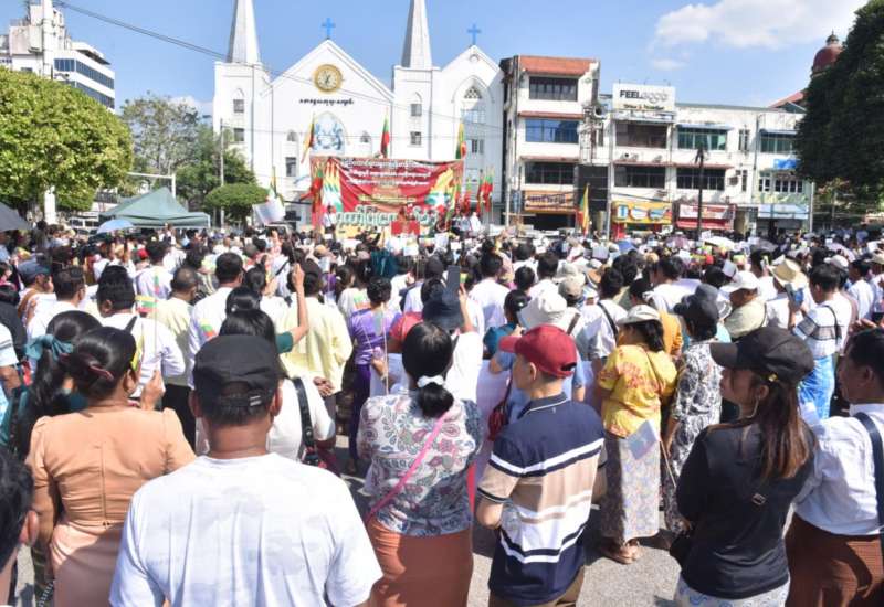 ပြည်ထောင်စုသမ္မတမြန်မာနိုင်ငံတော်၏ ဂုဏ်သိက္ခာနှင့် တရားမျှတသော အမှန်တရားအတွက် နယ်သာလန်နိုင်ငံ၊ သည်ဟိတ်ဂ်မြို့၊ အပြည်ပြည်ဆိုင်ရာတရားရုံး (ICJ) ၌ သွားရောက်ဖြေရှင်းနေသော မြန်မာကိုယ်စားလှယ်အဖွဲ့၏ လျှောက်လဲချေပချက်များအား ထောက်ခံဂုဏ်ပြုပွဲနှင့် ဂမ်ဘီယာနိုင်ငံ၏ မဟုတ်မမှန်စွပ်စွဲချက်များကို ကန့်ကွက်ရှုတ်ချသည့် အမျိုးသားရေးဆန္ဒထုတ်ဖော်ပွဲကို ယနေ့မွန်းလွဲပိုင်းတွင် ရန်ကုန်မြို့၊ မြို့တော်ခန်းမရှေ့၊ ယာဉ်ရပ်နားကွင်း၌ ပြုလုပ်ရာ မျိုးချစ်မြန်မာရဟန်းတော်များသမဂ္ဂမှ သံဃာတော်များ၊ သာသနာနွယ်ဝင် သီလရှင်များ၊ ပြည်သူများ၊ နိုင်ငံရေးပါတီများမှ ပါတီဝင်များ တက်ရောက်ကြသည်။