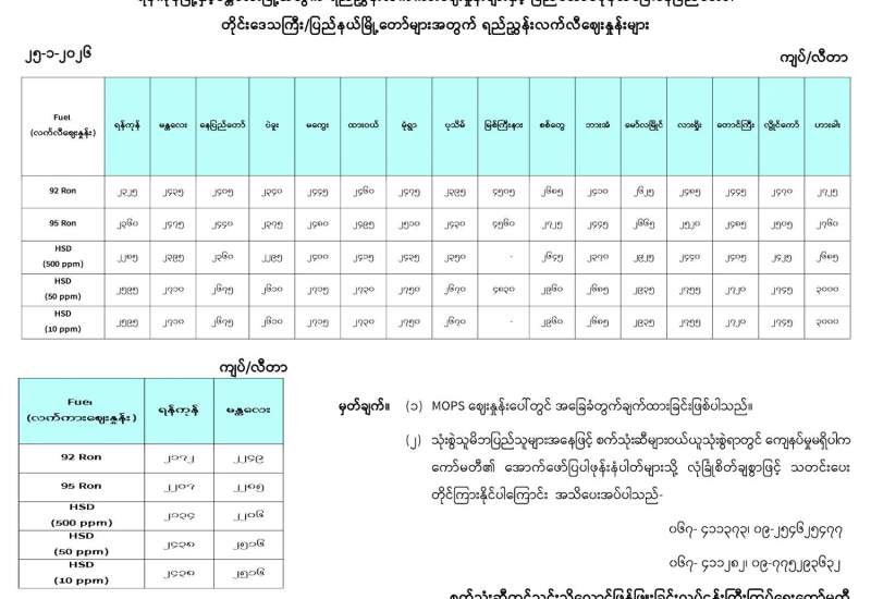 ရန်ကုန်မြို့နှင့် မန္တလေးမြို့အတွက် ရည်ညွှန်းလက်ကားဈေးနှုန်းများနှင့် ပြည်ထောင်စုနယ်မြေ နေပြည်တော်၊ တိုင်းဒေသကြီး/ပြည်နယ် မြို့တော်များအတွက် ရည်ညွှန်းလက်လီဈေးနှုန်းများ