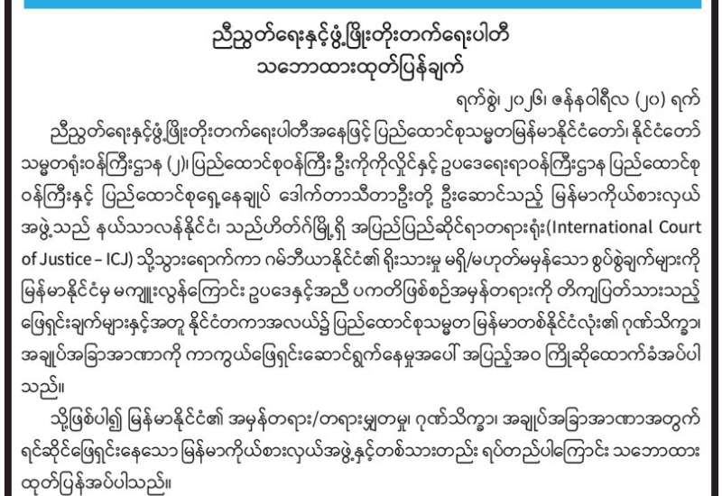 ညီညွတ်ရေးနှင့်ဖွံ့ဖြိုးတိုးတက်ရေးပါတီ သဘောထားထုတ်ပြန်ချက်
