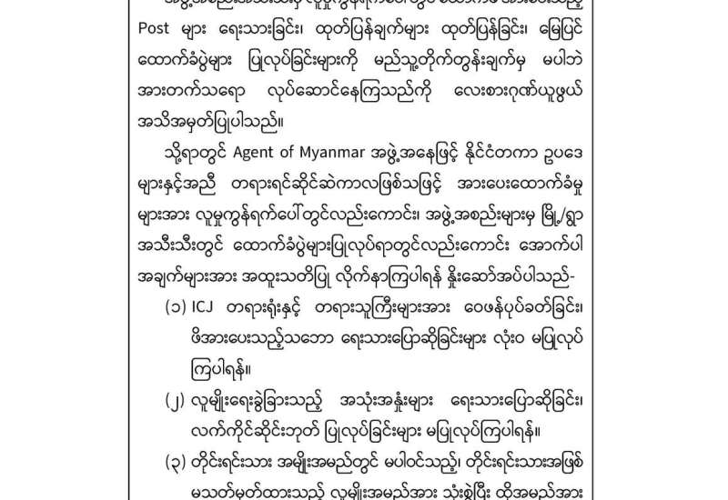 အကြမ်းဖက်အုပ်စုအဖြစ်ကြေညာထားသည့် CRPH ၊ NUG နှင့် ယင်းတို့၏ လက်ဝေခံအဖွဲ့အစည်းများ၊ ယင်းတို့နှင့်ဆက်နွှယ်နေသော အဖွဲ့အစည်းများ၊ လူပုဂ္ဂိုလ်များသည် နိုင်ငံတော်တည်ငြိမ်အေးချမ်းရေးကို ပျက်ပြားစေရန်နှင့် အစိုးရယန္တရားများ ပျက်ပြားစေရန်ရည်ရွယ်လျက် လှုံ့ဆော်ခြင်း၊ ဝါဒဖြန့်ခြင်းများပြုလုပ်ခဲ့မှုအပေါ် ဥပဒေနှင့်အညီ ထိရောက်စွာအရေးယူသွားမည်ဖြစ်ကြောင်းနှင့် ထိုသို့လှုံ့ဆော်သူ၊ ဝါဒဖြန့်သူများအား ဆက်လက်ဖော်ထုတ်အရေးယူသွားမည်ဖြစ်ကြောင်း မိဘပြည်သူများ သိရှိနိုင်ရေးအသိပေးသတင်းထုတ်ပြန်ပြီးဖြစ်သည်။