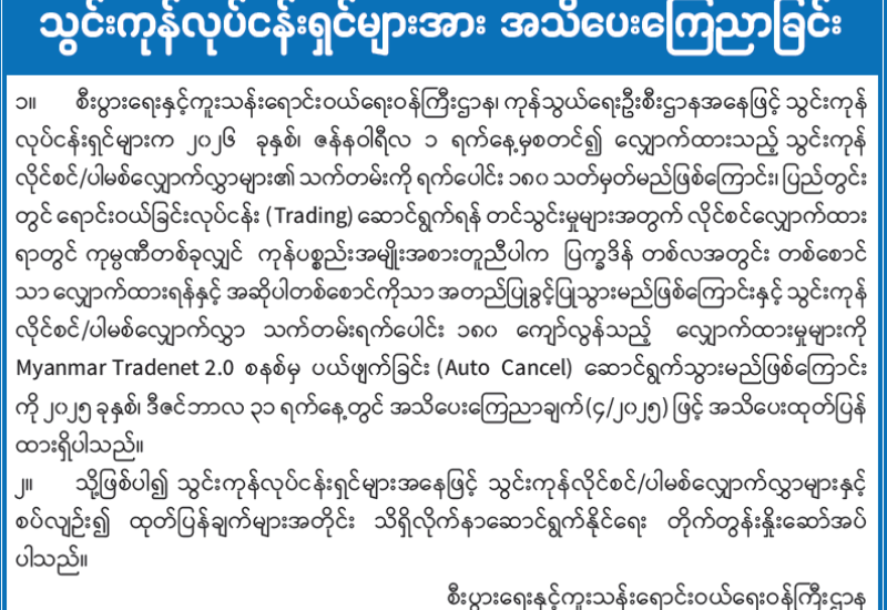 သွင်းကုန်လုပ်ငန်းရှင်များအား အသိပေးကြေညာခြင်း