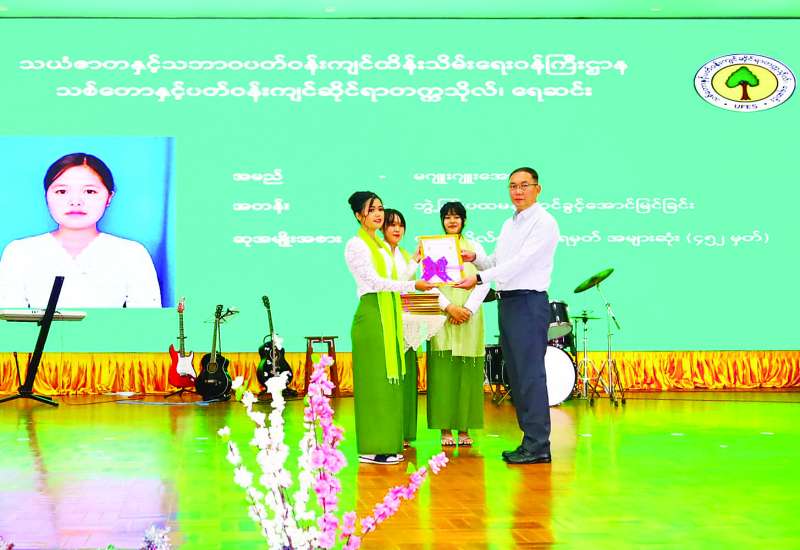 သယံဇာတနှင့်သဘာဝပတ်ဝန်းကျင်ထိန်းသိမ်းရေးဝန်ကြီးဌာန သစ်တောနှင့်ပတ်ဝန်းကျင်ဆိုင်ရာ တက္ကသိုလ်၏ ၂၀၂၅-၂၀၂၆ ပညာသင်နှစ် မောင်မယ်သစ်လွင်ကြိုဆိုပွဲနှင့် ဆုချီးမြှင့်ခြင်းအခမ်းအနားကို ယမန်နေ့ညနေပိုင်းက နေပြည်တော်ရှိ တက္ကသိုလ်များနယ်မြေ (ရေဆင်း)၊ သစ်တောနှင့်ပတ်ဝန်းကျင်ဆိုင်ရာတက္ကသိုလ်၊ ဘွဲ့နှင်းသဘင်ခန်းမ၌ ကျင်းပရာ ပြည်ထောင်စုဝန်ကြီး ဦးခင်မောင်ရီ၊ ဒုတိယဝန်ကြီး ဦးမင်းသူ၊ အမြဲတမ်းအတွင်းဝန်နှင့် ဌာနဆိုင်ရာတာဝန်ရှိသူများ၊ ပါမောက္ခချုပ်နှင့် ဆရာ ဆရာမများ၊ ကျောင်းသား ကျောင်းသူများ တက်ရောက်ကြသည်။