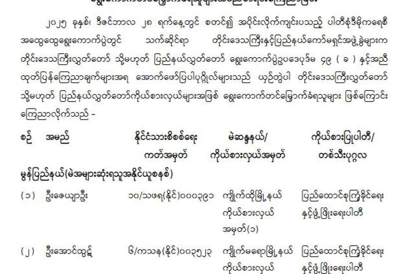 တိုင်းဒေသကြီးလွှတ်တော် သို့မဟုတ် ပြည်နယ်လွှတ်တော်ကိုယ်စားလှယ်အဖြစ် ရွေးကောက်တင်မြှောက်ခံရသူများအမည်စာရင်း ကြေညာခြင်း