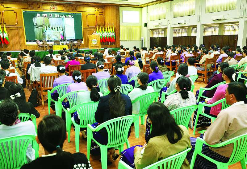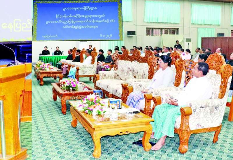နိုင်ငံ့ဝန်ထမ်းအကြီးအမှူးများအတွက် ဥပဒေအသိပညာပြန့်ပွား ရေးသင်တန်းအမှတ်စဉ်(၆) ဖွင့်ပွဲအခမ်းအနားကို ယနေ့နံနက်ပိုင်းတွင် ဥပဒေရေးရာဝန်ကြီးဌာန မြေညီထပ်အစည်းအဝေးခန်းမ၌ကျင်းပရာ ပြည်ထောင်စုဝန်ကြီးနှင့် ပြည်ထောင်စုရှေ့နေချုပ် ဒေါက်တာသီတာဦး၊ နိုင်ငံတော် သမ္မတရုံးဝန်ကြီးဌာန(၄) ပြည်ထောင်စုဝန်ကြီး၊ ပြည်ထောင်စုစာရင်းစစ်ချုပ်၊ စိုက်ပျိုးရေး၊ မွေးမြူရေးနှင့် ဆည်မြောင်းဝန်ကြီးဌာန ဒုတိယဝန်ကြီး၊ ဥပဒေရေးရာဝန်ကြီးဌာန ဒုတိယဝန်ကြီးနှင့် ဒုတိယရှေ့နေချုပ်၊ ရခိုင်ပြည်နယ်ဥပဒေချုပ်၊ ဥပဒေရေးရာဝန်ကြီးဌာနမှ ဌာနဆိုင်ရာ တာဝန်ရှိသူများနှင့် သင်တန်းသား သင်တန်းသူများ တက်ရောက်ကြသည်။