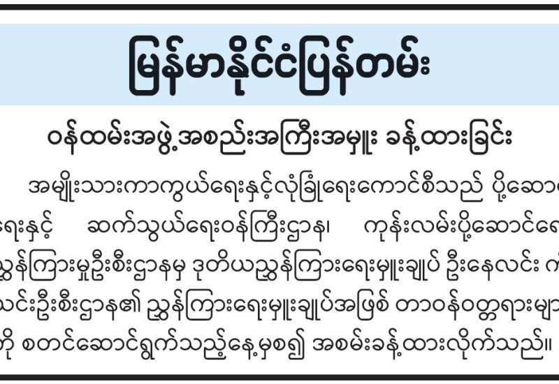 စီမံကိန်းနှင့်မူဝါဒဆိုင်ရာ ချေးငွေထုတ်ချေးရန်စိစစ်ရေးအဖွဲ့ အစည်းအဝေးအမှတ်စဉ် (၁/ ၂၀၂၆) ကို ယနေ့မွန်းလွဲပိုင်းတွင် ပြည်တွင်းအခွန်များဦးစီးဌာန ရုံး အမှတ် (၄၆) ၌ ကျင်းပရာ စိစစ်ရေးအဖွဲ့ဥက္ကဋ္ဌ ဘဏ္ဍာရေးနှင့်အခွန်ဝန်ကြီးဌာန ပြည်ထောင်စုဝန်ကြီး ဒေါက်တာကံဇော်၊ အဖွဲ့ဝင်များဖြစ်ကြသည့် ဒုတိယဝန်ကြီး ဒေါ်သန်းသန်းလင်း၊ ဥပဒေရေးရာဝန်ကြီးဌာန ဒုတိယဝန်ကြီး ဒေါက်တာ ထိန်လင်းဦး၊ မြန်မာ နိုင်ငံတော်ဗဟိုဘဏ် ဒုတိယဥက္ကဋ္ဌ ဒေါက်တာလင်းအောင်နှင့်ဌာနဆိုင်ရာ တာဝန်ရှိသူများတက်ရောက်ကြသည်။