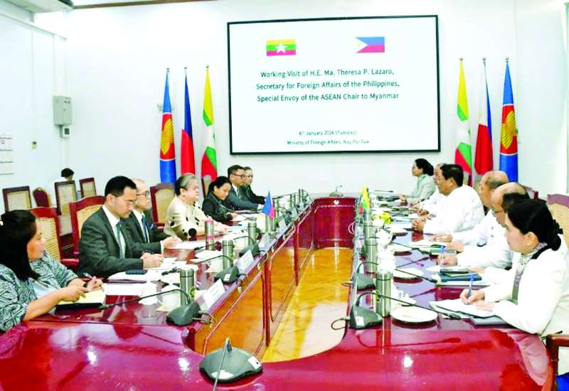 နိုင်ငံခြားရေးဝန်ကြီးဌာန ပြည်ထောင်စုဝန်ကြီး ဦးသန်းဆွေသည် ဇန်နဝါရီ ၅ ရက်မှ ၇ ရက်အထိ မြန်မာနိုင်ငံသို့ အလုပ်သဘောခရီးစဉ် လာရောက်သည့် အာဆီယံဥက္ကဋ္ဌ၏ မြန်မာနိုင်ငံဆိုင်ရာ အထူး ကိုယ်စားလှယ် ဖိလစ်ပိုင်နိုင်ငံခြားရေးဝန်ကြီး H.E. Ms. Maria Theresa Parreno Lazaro ဦးဆောင်သည့် ကိုယ်စားလှယ်အဖွဲ့အား ယနေ့တွင် နေပြည်တော်ရှိ နိုင်ငံခြားရေးဝန်ကြီးဌာန၌ တွေ့ဆုံသည်။