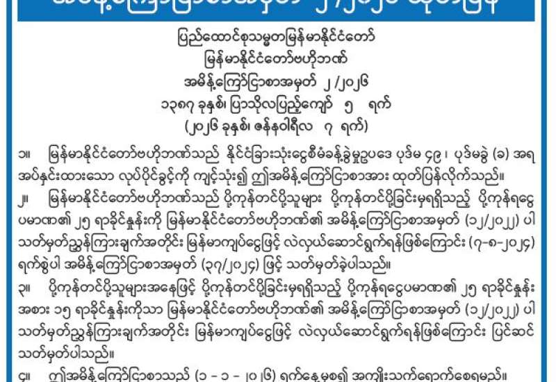 မြန်မာနိုင်ငံတော်ဗဟိုဘဏ် အမိန့်ကြော်ငြာစာအမှတ် ၂ /၂၀၂၆ ထုတ်ပြန်