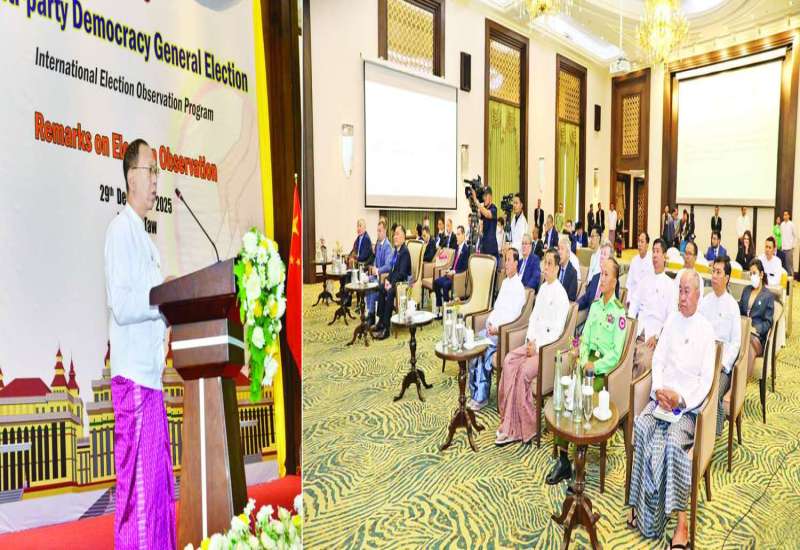 ၂၀၂၅ ခုနှစ် ဒီဇင်ဘာ ၂၈ ရက်တွင် မြို့နယ်ပေါင်း ၁၀၂ မြို့နယ်၌ ကျင်းပပြီးစီးခဲ့သည့် အပိုင်း (၁) ရွေးကောက်ပွဲသို့ လာရောက်လေ့လာခဲ့ကြသည့် နိုင်ငံတကာရွေးကောက်ပွဲ စောင့်ကြည့်လေ့လာသူများ၏ စောင့်ကြည့်လေ့လာခဲ့မှုဆိုင်ရာ မှတ်ချက်ပြုအခမ်းအနားကို ယနေ့ နံနက် ၈ နာရီက နေပြည်တော်ရှိ Jasmine Nay Pyi Taw ဟိုတယ်၌ ကျင်းပပြုလုပ်ရာ ပြည်ထောင်စုရွေးကောက်ပွဲကော်မရှင်ဥက္ကဋ္ဌ ဦးသန်းစိုး တက်ရောက်အမှာစကား ပြောကြားသည်။