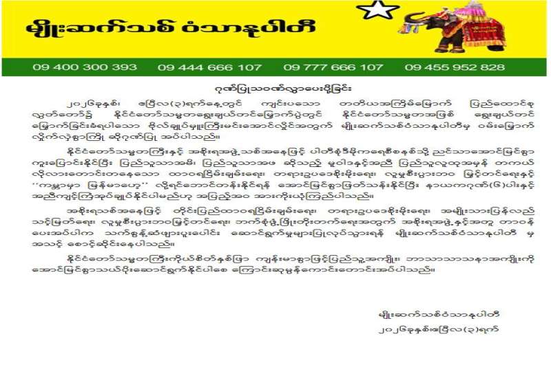 ၂၀၂၆ ခုနှစ်၊ ဧပြီလ ၃ ရက်တွင် ကျင်းပသည့် နိုင်ငံတော်သမ္မတရွေးချယ်တင်မြှောက်ပွဲ၌ ပြည်ထောင်စုလွှတ်တော်ကိုယ်စားလှယ်အားလုံးပါဝင်သော နိုင်ငံတော်သမ္မတရွေးချယ်တင်မြှောက်ရေးအဖွဲ့က ရွေးကောက်ခံ ပြည်သူ့လွှတ်တော်ကိုယ်စားလှယ်များ အစုအဖွဲ့မှ ဒုတိယသမ္မတအဖြစ် ရွေးချယ်တင်မြှောက်ထားသော ဗိုလ်ချုပ်မှူးကြီးမင်းအောင်လှိုင်အား နိုင်ငံတော်သမ္မတအဖြစ် ရွေးချယ်တင်မြှောက်ခြင်းခံရသည့်အတွက် မျိုးဆက်သစ်ဝံသာနုပါတီ၊ မြန်မာနိုင်ငံဟုတ်ကြန့်တရုတ်မျိုးနွယ်အသင်းချုပ်၊ မြန်မာပြည်ဖွားတရုတ်ကုသိုလ်ဖြစ်အသင်း၊ မြန်မာနိုင်ငံတရုတ်ကုန်သည်များအသင်းချုပ်၊ မြန်မာနိုင်ငံဆိုင်ရာဝိန်းကျိုး ကုန်သည်ကြီးများအသင်းချုပ် Myanmar Wenzhou General Chamber of Commerce၊ မြန်မာနိုင်ငံဆိုင်ရာ အန့်ဟွေးကုန်သည်ကြီးများအသင်း၊ ရန်ကုန်ယူနန်လူမှုကူညီရေးအသင်း၊ ကောင်းတုံကုန်သည်နှင့် လုပ်ငန်းရှင်များအသင်း၊ မြန်မာ-အိန္ဒိယချစ်ကြည်ရေးအသင်း၊ မြန်မာ-အိန္ဒိယအပြည်ပြည်ဆိုင်ရာစီးပွားရေး လုပ်ငန်းရှင်များအသင်းချုပ်(MIIBF)၊