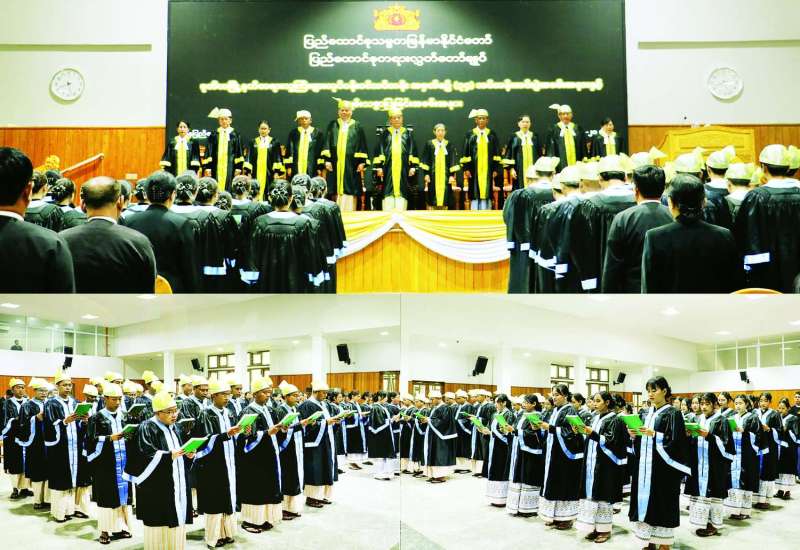 တရားရေးအရာရှိကြီးများ မွမ်းမံသင်တန်းအမှတ်စဉ် (၅) သင်တန်းဆင်းပွဲ အခမ်းအနားကို ယမန်နေ့နံနက် ၇ နာရီတွင် ပြည်ထောင်စုတရားလွှတ်တော်ချုပ် တရားရေးကောလိပ် (JudicialCollege)၌ ကျင်းပရာ ပြည်ထောင်စုတရားသူကြီးချုပ် ဦးသာဌေး တက်ရောက်၍ သင်တန်းဆင်းအမှာစကားပြောကြားသည်။