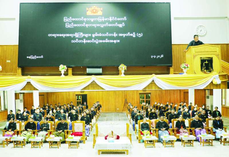 ဒုတိယမြို့နယ် တရားသူကြီးများ လုပ်ငန်းဝင်သင်တန်းအမှတ်စဉ် (၃၄) သင်တန်းဆင်းပွဲနှင့် ကျမ်းသစ္စာပြုပွဲအခမ်းအနားကို ယနေ့နံနက် ၈ နာရီတွင် ပြည်ထောင်စုတရားလွှတ်တော်ချုပ် Judicial College ၌ကျင်းပရာ ပြည်ထောင်စုတရားသူကြီးချုပ် ဦးသာဌေး တက်ရောက်၍ သင်တန်းဆင်း အမှာစကား ပြောကြားသည်။