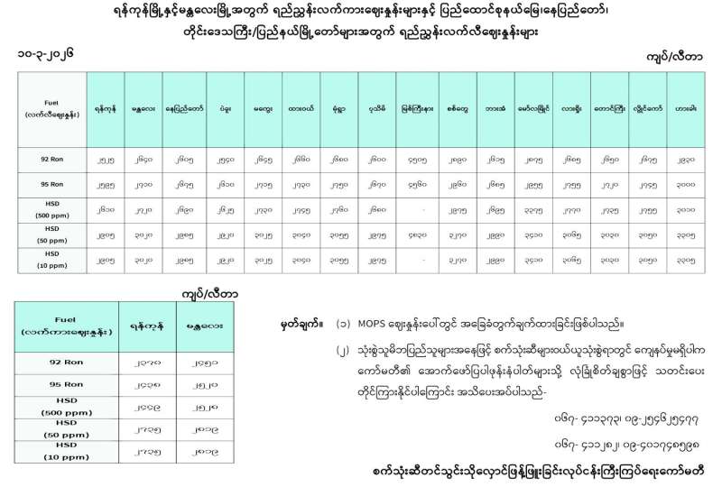 ရန်ကုန်မြို့နှင့် မန္တလေးမြို့အတွက် ရည်ညွှန်းလက်ကားဈေးနှုန်းများနှင့် ပြည်ထောင်စုနယ်မြေ နေပြည်တော်၊ တိုင်းဒေသကြီး/ပြည်နယ် မြို့တော်များအတွက် ရည်ညွှန်းလက်လီဈေးနှုန်းများ