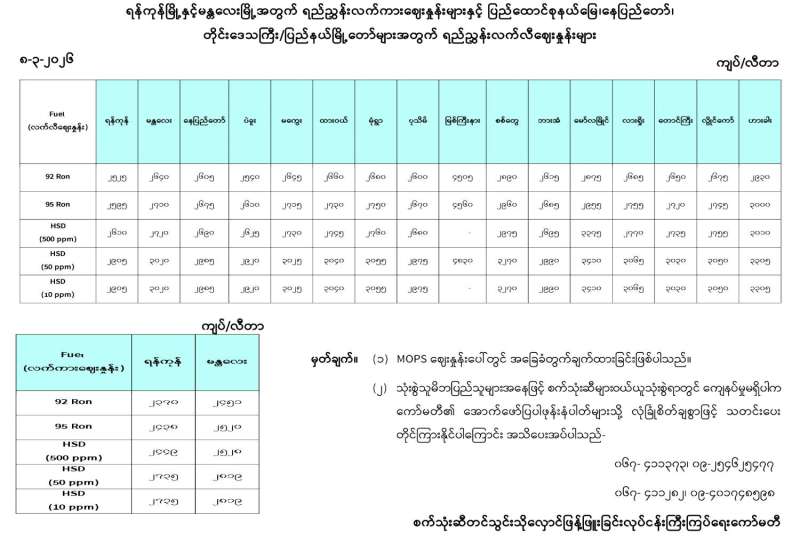 ရန်ကုန်မြို့နှင့် မန္တလေးမြို့အတွက် ရည်ညွှန်းလက်ကားဈေးနှုန်းများနှင့် ပြည်ထောင်စုနယ်မြေ နေပြည်တော်၊ တိုင်းဒေသကြီး/ပြည်နယ် မြို့တော်များအတွက် ရည်ညွှန်းလက်လီဈေးနှုန်းများ