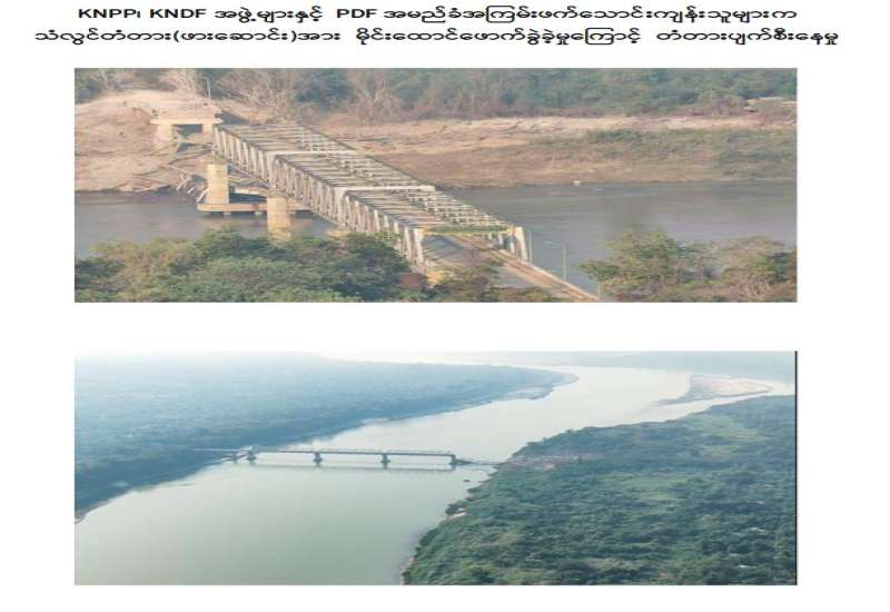 ကယားပြည်နယ်၊ မယ်စဲ့မြို့နယ်၊ ဖားဆောင်းမြို့အနီးရှိ သံလွင်တံတား (ဖားဆောင်း) အား KNPP ၊ KNDF အဖွဲ့များနှင့် PDF အမည်ခံ အကြမ်းဖက်သောင်းကျန်းသူများက ယနေ့နံနက်ပိုင်းတွင် မိုင်းထောင်ဖောက်ခွဲဖျက်ဆီးခဲ့ကြောင်း သိရှိရသည်။