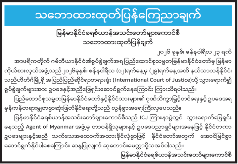 မြန်မာနိုင်ငံခရစ်ယာန်အသင်းတော်များကောင်စီ သဘောထားထုတ်ပြန်ချက်