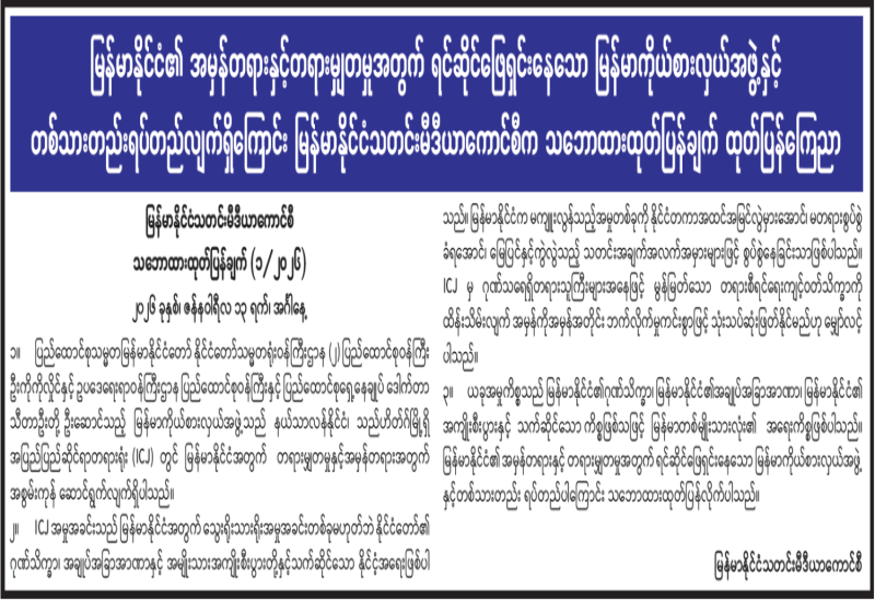 မြန်မာနိုင်ငံ၏ အမှန်တရားနှင့်တရားမျှတမှုအတွက် ရင်ဆိုင်ဖြေရှင်းနေသော မြန်မာကိုယ်စားလှယ်အဖွဲ့နှင့် တစ်သားတည်းရပ်တည်လျက်ရှိကြောင်း မြန်မာနိုင်ငံသတင်းမီဒီယာကောင်စီက သဘောထားထုတ်ပြန်ချက် ထုတ်ပြန်ကြေညာ